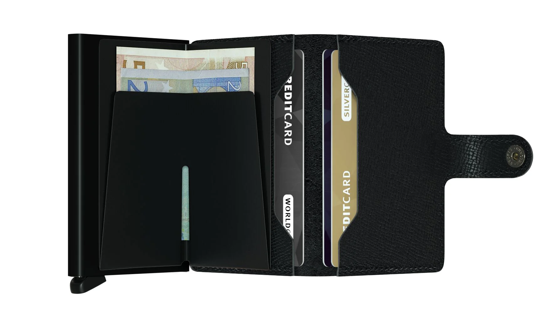 Small in size and surprisingly large in storage capacity, the Miniwallet combines the best of both worlds. The exterior holds banknotes, receipt and cards, while the aluminium Cardprotector allows you to slide out cards with one simple motion and protects them from bending, breaking and unwanted wireless communication.